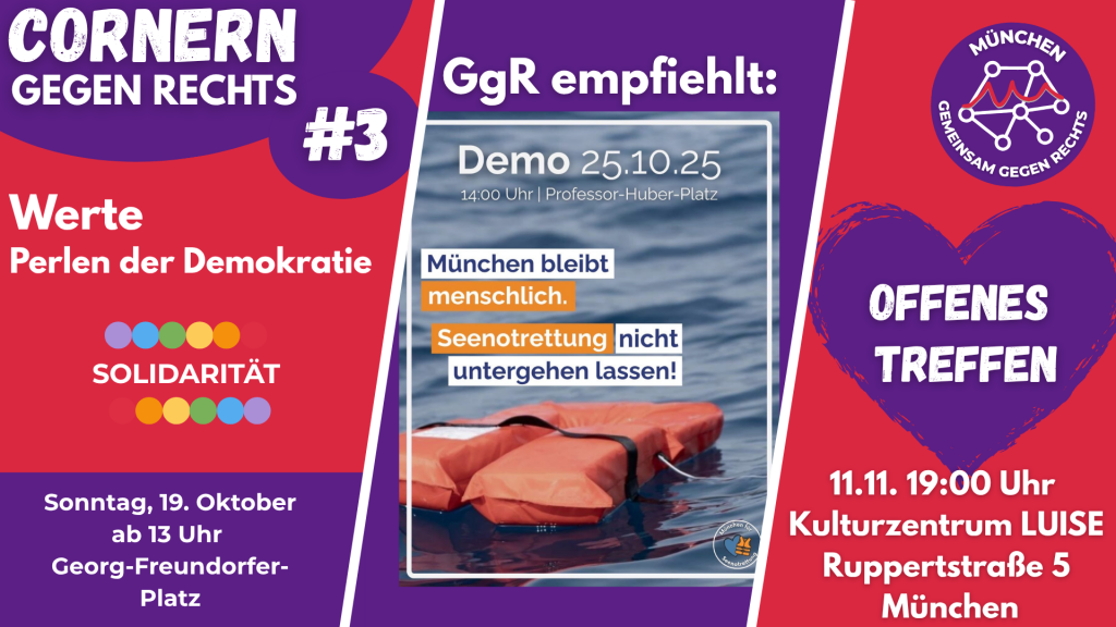 📅 Cornern gegen Rechts geht in eine neue Runde! Seid Ihr dabei? – Außerdem: 🫶 Unsere bisherigen Cornern-Aktionen, und: 📣 Demo “München bleibt menschlich – Seenotrettung nicht untergehen lassen!”