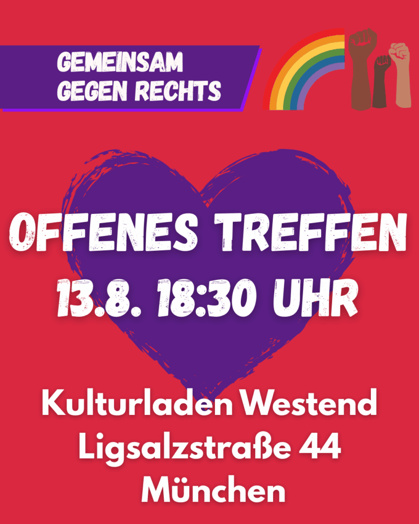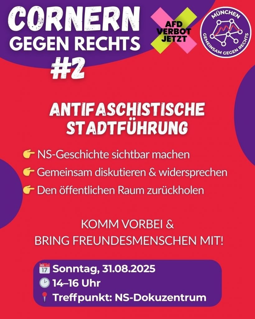 München, 11. August 2025 – Am Sonntag, den 17. August 2025, findet am Rotkreuzplatz zum ersten Mal „Cornern gegen Rechts“ statt. Mit dieser – und weiteren geplanten Aktionen- setzt das Bündnis Gemeinsam gegen Rechts München ein klares Zeichen gegen die Normalisierung von rechten Parolen, Stickern und Aufmärschen im öffentlichen Raum.