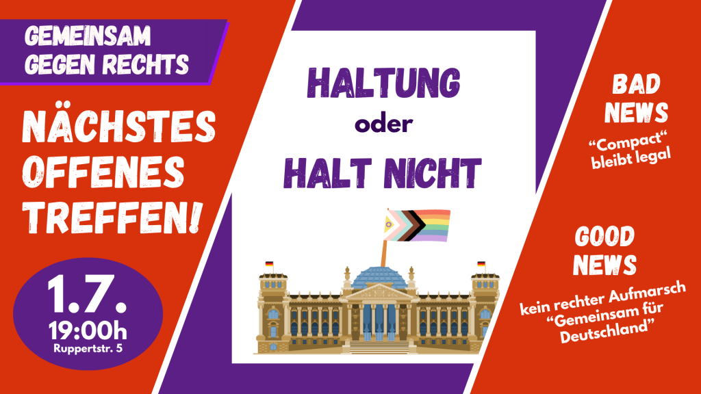 📅 Nächstes Plenum am 01.07.2025 · 19:00 Uhr 🔥 CSD München: GgR in Aktion 🚩 CSD Berlin: Julia Klöckner … 🚫 Bad News: Compact bleibt legal 🤗 Good News: Kein „Marsch für Deutschland“