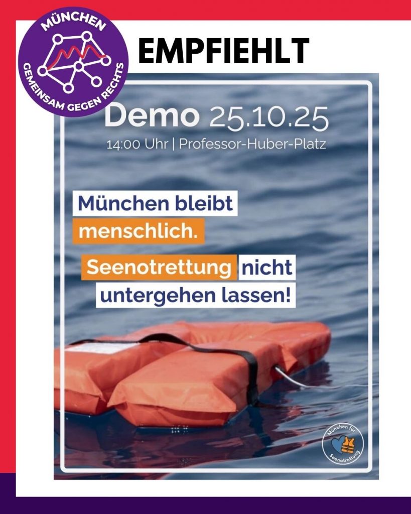 Demo „München bleibt menschlich – Seenotrettung nicht untergehen lassen“ am 25.10.2025 ab 14 Uhr am Professor-Huber-Platz.
